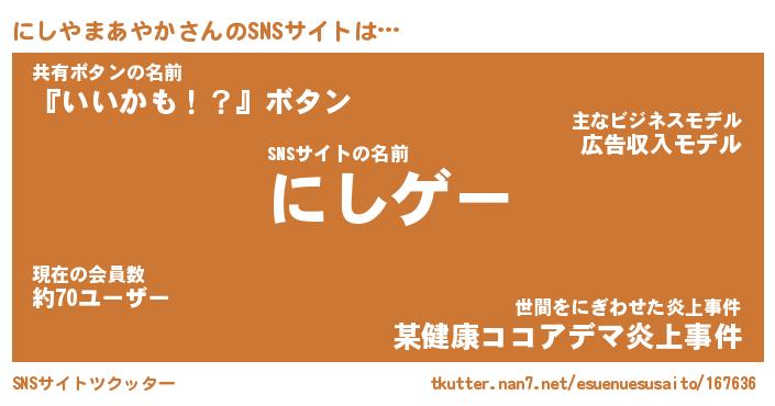 | ポケモン風あだ名 | 『ニシチュウ』『ニシヤダネ』 |