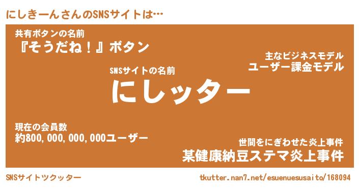 | ヘコむあだ名 | 『にしにゅー』『酢こんぶ』『にしお』 |