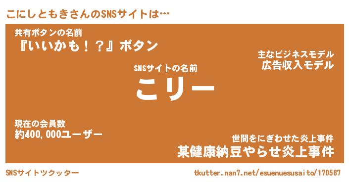 | 肩書あだ名 | 『こにしともきCEO』『こにしともき大統領』 |