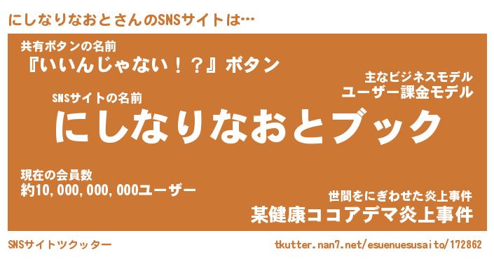 | 胡散臭い通販商品みたいなあだ名 | 『億万長者になれるブレスレット…その名も「にしなりなおと」』 |