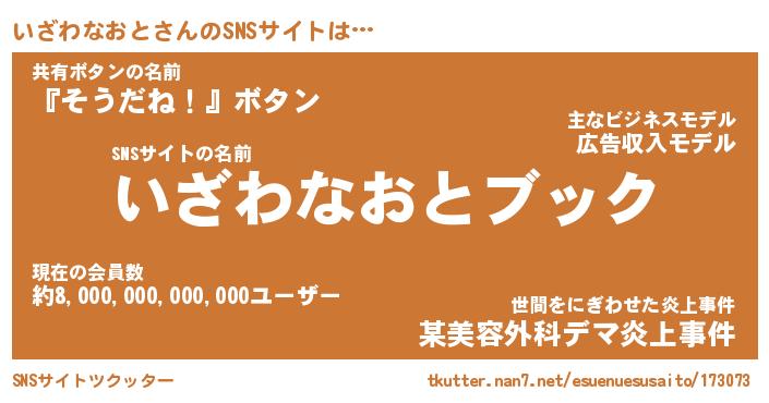 | 男性向けラノベタイトル風あだ名 | 『イザワナオトアートオンライン』 |