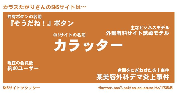 | ツイッター | カラスたかりさんのツイッターID『fukuyoka_kun』 |