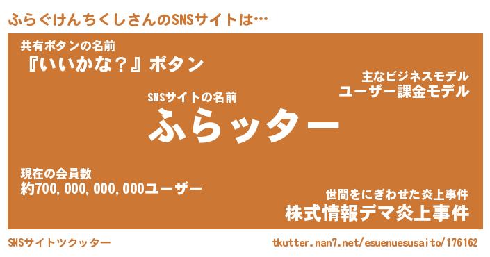 | 胡散臭い通販商品みたいなあだ名 | 『億万長者になれるブレスレット…その名も「ふらぐけんちくし」』 |
