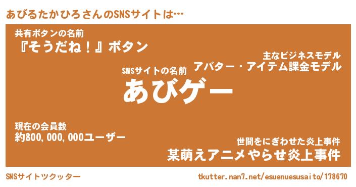 | 男性向けラノベタイトル風あだ名 | 『あびるたかひろの憂鬱』 |