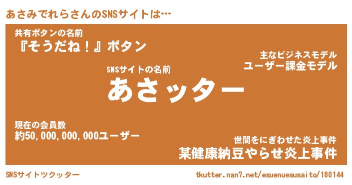 | 男性向けラノベタイトル風あだ名 | 『アサミデレラアートオンライン』 |