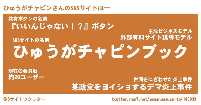 | 男性向けラノベタイトル風あだ名 | 『ヒュウガチャピンアートオンライン』 |