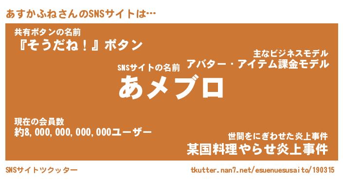 | 肩書あだ名 | 『あすかふね店長』『あすかふね総理大臣』 |