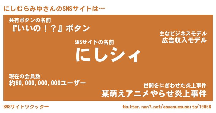 | 男性向けラノベタイトル風あだ名 | 『にしむらみゆの憂鬱』 |