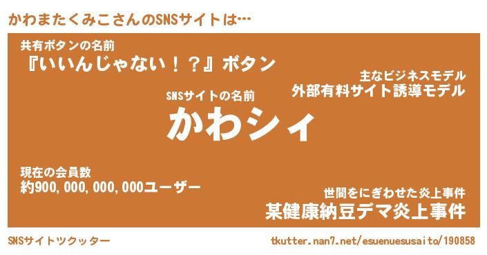 | 肩書あだ名 | 『かわまたくみこCEO』 |