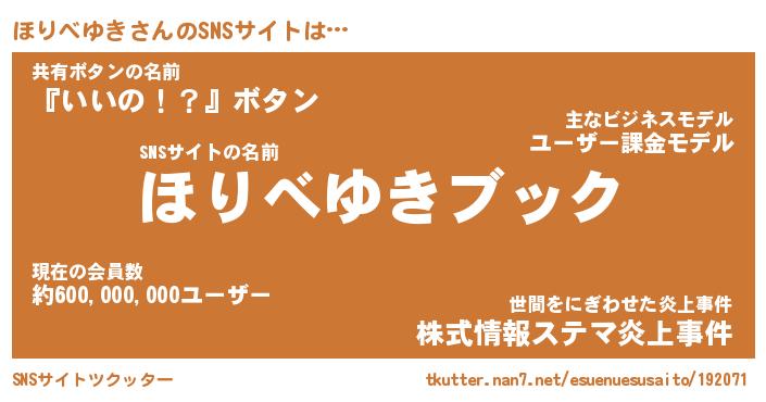 | 肩書あだ名 | 『ほりべゆきCEO』『ほりべゆき総理大臣』 |