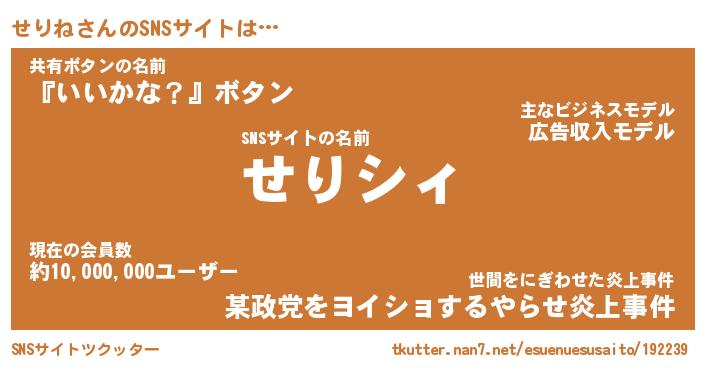 | 肩書あだ名 | 『せりねCEO』『せりね国家主席』 |