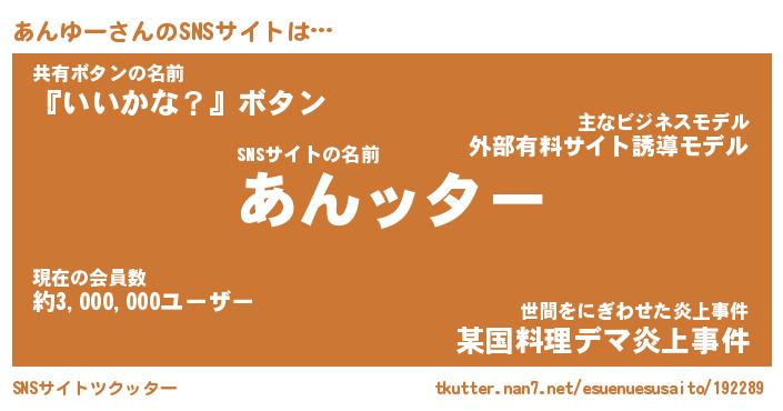 | 意味不明あだ名 | 『ペロリンあんゆー』『永久保存あんゆー』 |