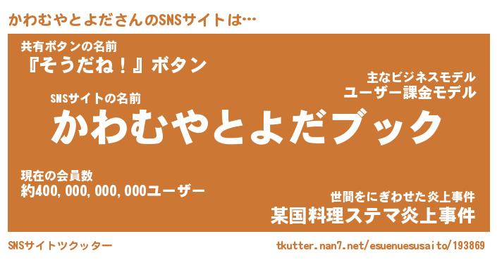 | 胡散臭い通販商品みたいなあだ名 | 『億万長者になれるブレスレット…その名も「かわむやとよだ」』 |