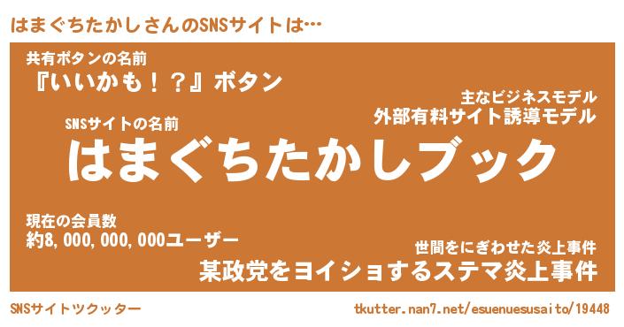 | 男性向けラノベタイトル風あだ名 | 『ハマグチタカシアートオンライン』 |