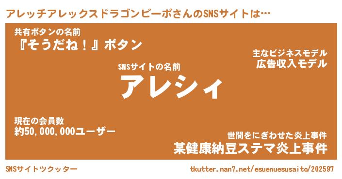 | 男性向けラノベタイトル風あだ名 | 『アレッチアレックスドラゴンピーポの憂鬱』 |