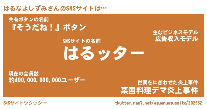 | 胡散臭い通販商品みたいなあだ名 | 『億万長者になれるブレスレット…その名も「はるなよしずみ」』 |