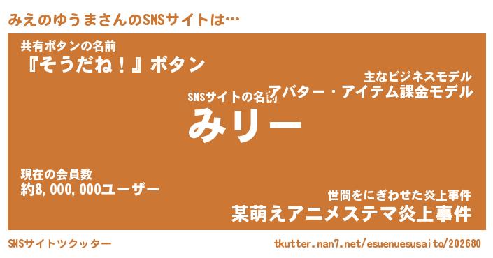 | 肩書あだ名 | 『みえのゆうま社長』『みえのゆうま団長』 |