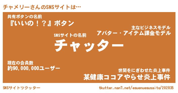 | 男性向けラノベタイトル風あだ名 | 『チャメリーアートオンライン』 |
