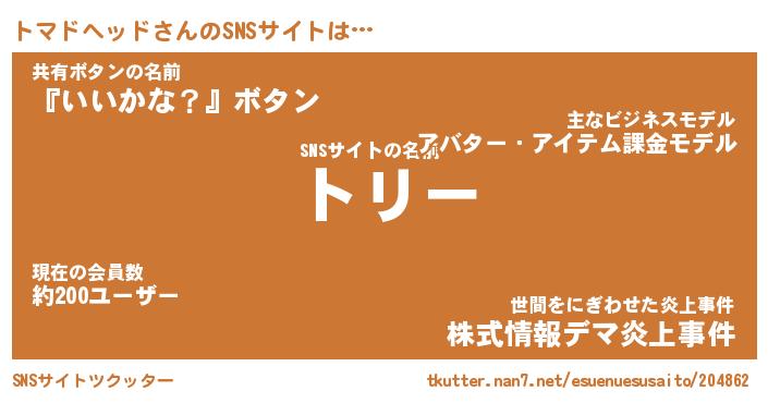 | 男性向けラノベタイトル風あだ名 | 『トマドヘッドの憂鬱』 |