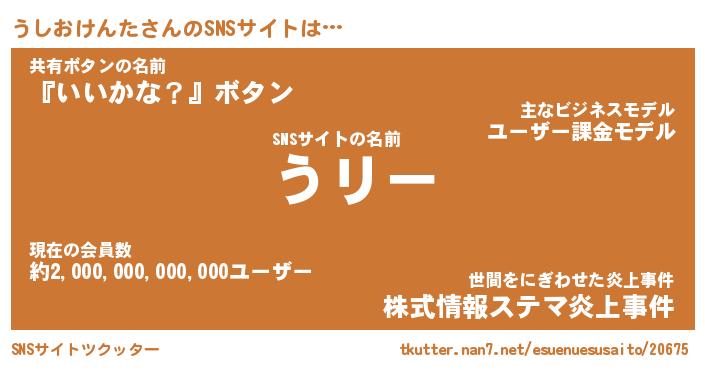 | 肩書あだ名 | 『うしおけんたCEO』『うしおけんた大統領』 |