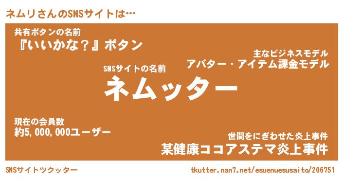 | 肩書あだ名 | 『ネムリCEO』『ネムリ大統領』 |