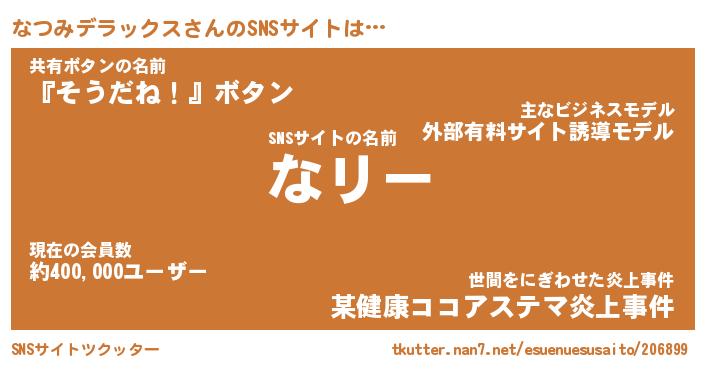 | 男性向けラノベタイトル風あだ名 | 『なつみデラックスの憂鬱』 |