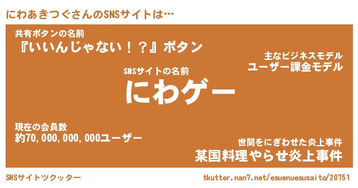 | 胡散臭い通販商品みたいなあだ名 | 『必ず成功するブレスレット…その名も「にわあきつぐ」』 |