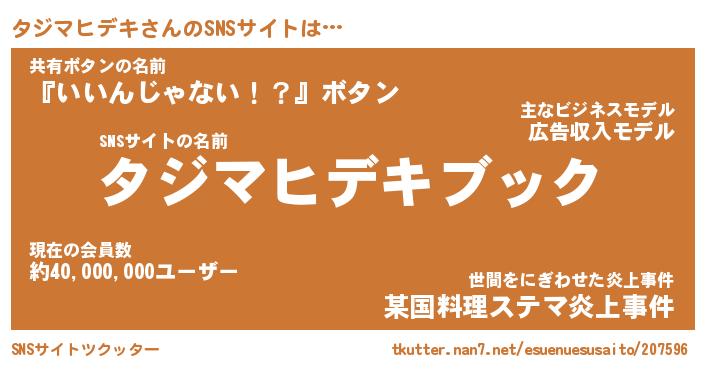 | 肩書あだ名 | 『タジマヒデキCEO』『タジマヒデキ団長』 |