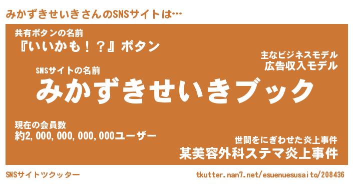 | 胡散臭い通販商品みたいなあだ名 | 『億万長者になれる霊験あらたかなお札…その名も「みかずきせいき」』 |