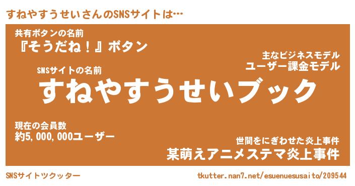 | 男性向けラノベタイトル風あだ名 | 『スネヤスウセイアートオンライン』 |