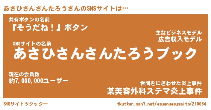 | 男性向けラノベタイトル風あだ名 | 『アサヒサンサンタロウアートオンライン』 |