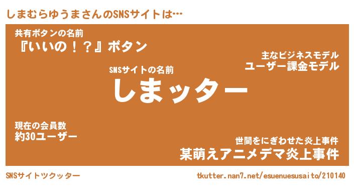 | 男性向けラノベタイトル風あだ名 | 『シマムラユウマアートオンライン』 |