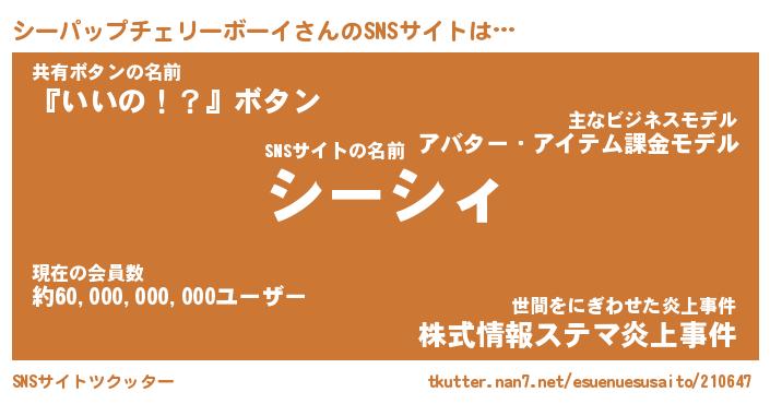 | ツイッター | シーパップチェリーボーイさんのツイッターID『konnyaku_kun』 |