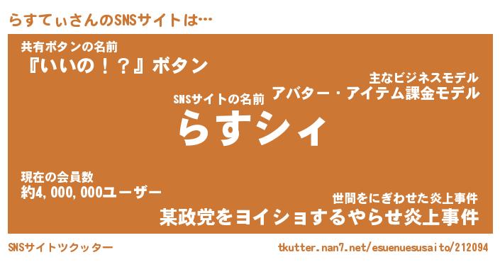 | 肩書あだ名 | 『らすてぃCEO』『らすてぃ大統領』 |