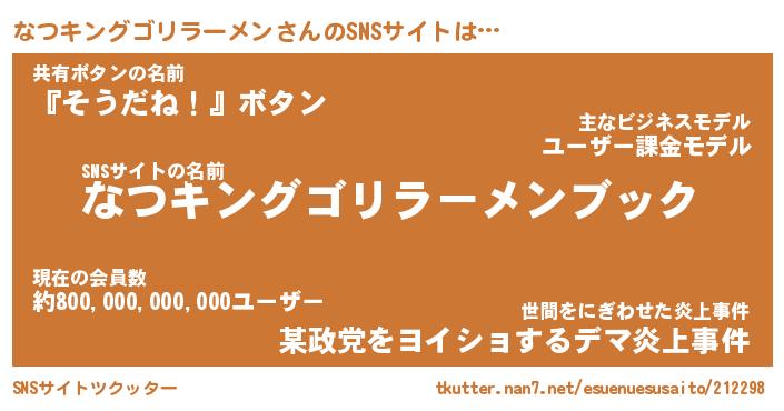 | 男性向けラノベタイトル風あだ名 | 『ナツキングゴリラーメンアートオンライン』 |