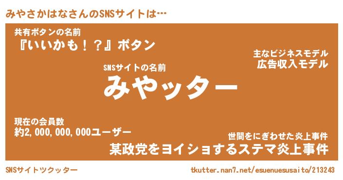 | 胡散臭い通販商品みたいなあだ名 | 『億万長者になれる霊験あらたかなお札…その名も「みやさかはな」』 |