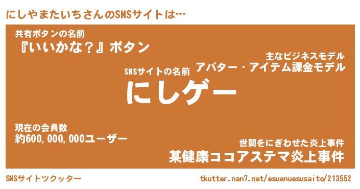 | 肩書あだ名 | 『にしやまたいち社長』 |