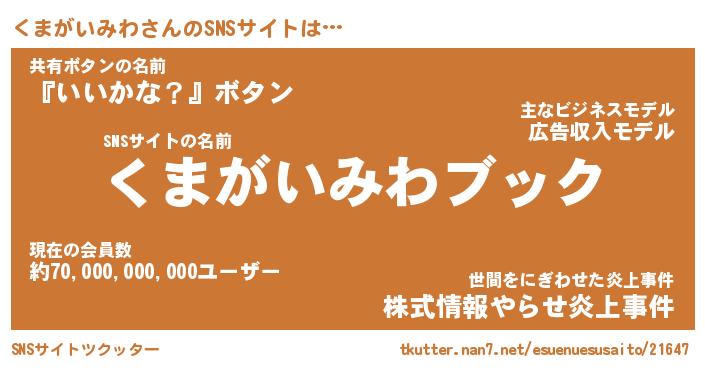 | 胡散臭い通販商品みたいなあだ名 | 『億万長者になれるブレスレット…その名も「くまがいみわ」』 |