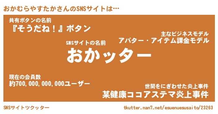 | 肩書あだ名 | 『おかむらやすたか御曹司』 |