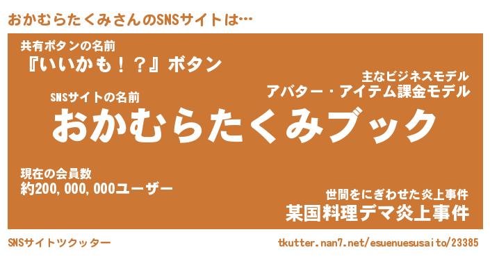 | 胡散臭い通販商品みたいなあだ名 | 『億万長者になれるブレスレット…その名も「おかむらたくみ」』 |