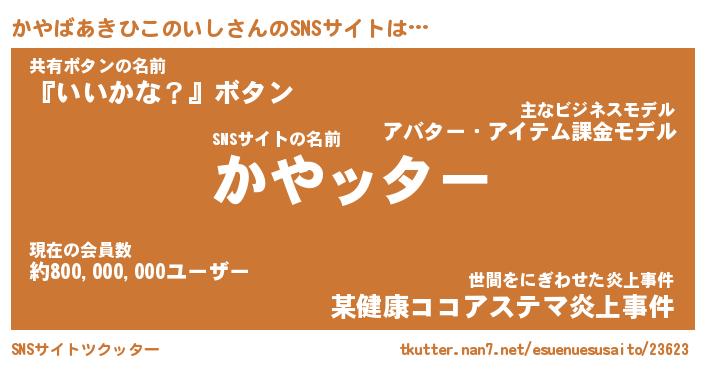 | 男性向けラノベタイトル風あだ名 | 『カヤバアキヒコノイシアートオンライン』 |