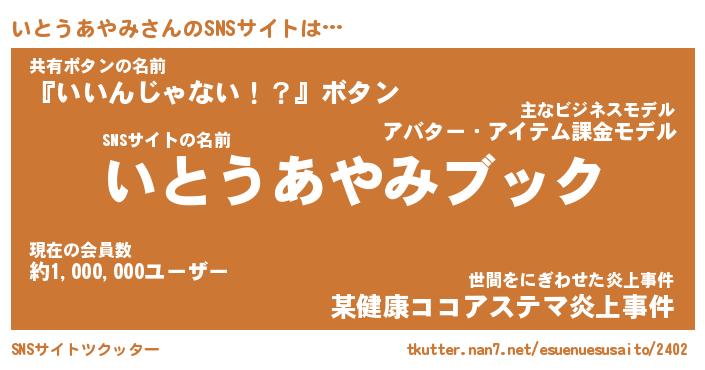 | 胡散臭い通販商品みたいなあだ名 | 『億万長者になれるブレスレット…その名も「いとうあやみ」』 |