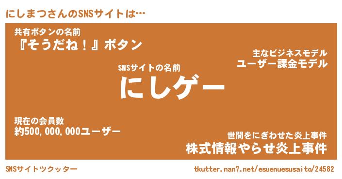 | 男性向けラノベタイトル風あだ名 | 『にしまつの憂鬱』 |