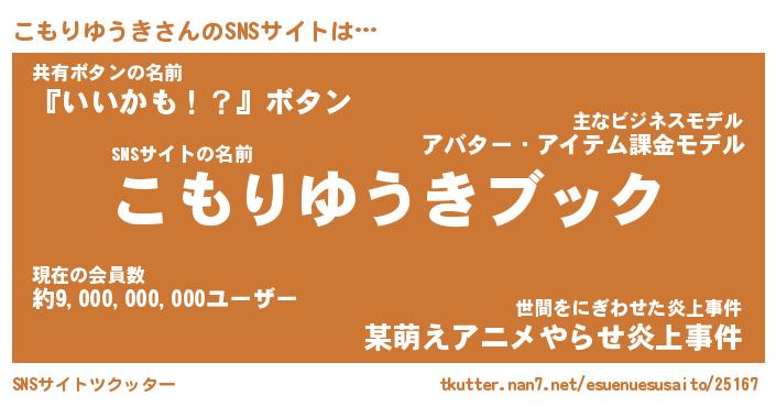 | 男性向けラノベタイトル風あだ名 | 『コモリユウキアートオンライン』 |
