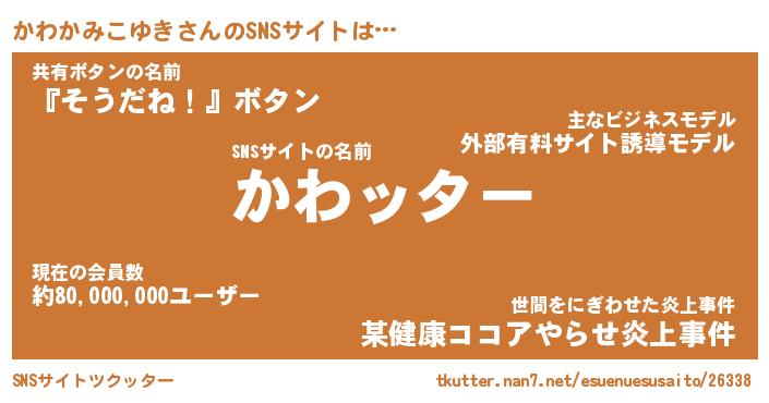 | 胡散臭い通販商品みたいなあだ名 | 『億万長者になれるブレスレット…その名も「かわかみこゆき」』 |