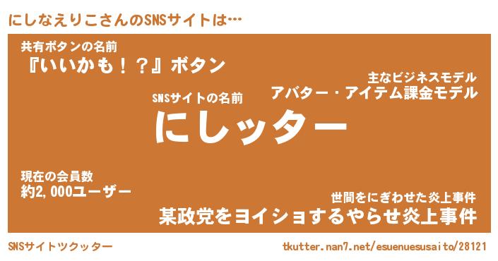 | 男性向けラノベタイトル風あだ名 | 『ニシナエリコアートオンライン』 |