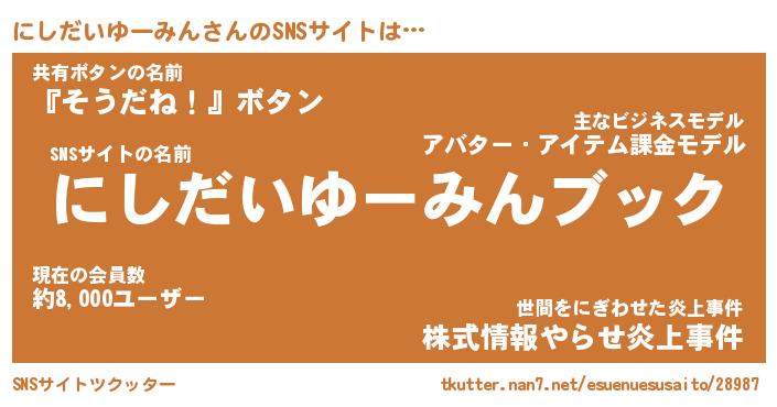 | 肩書あだ名 | 『にしだいゆーみん御曹司』 |