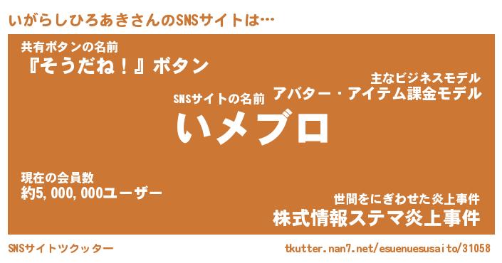 | 男性向けラノベタイトル風あだ名 | 『イガラシヒロアキアートオンライン』 |