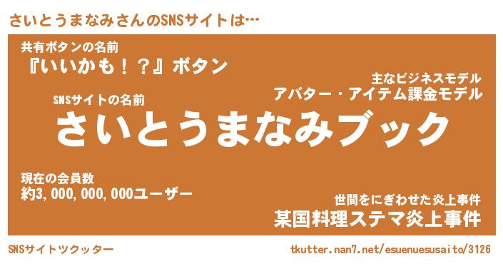 | 胡散臭い通販商品みたいなあだ名 | 『億万長者になれるブレスレット…その名も「さいとうまなみ」』 |