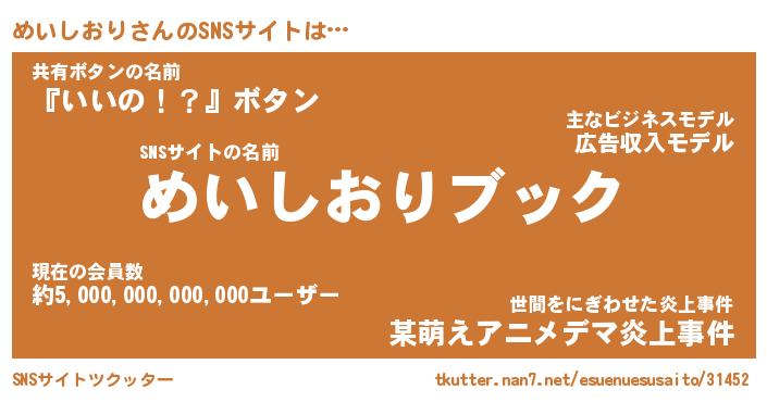 | 肩書あだ名 | 『めいしおり店長』『めいしおり総理大臣』 |